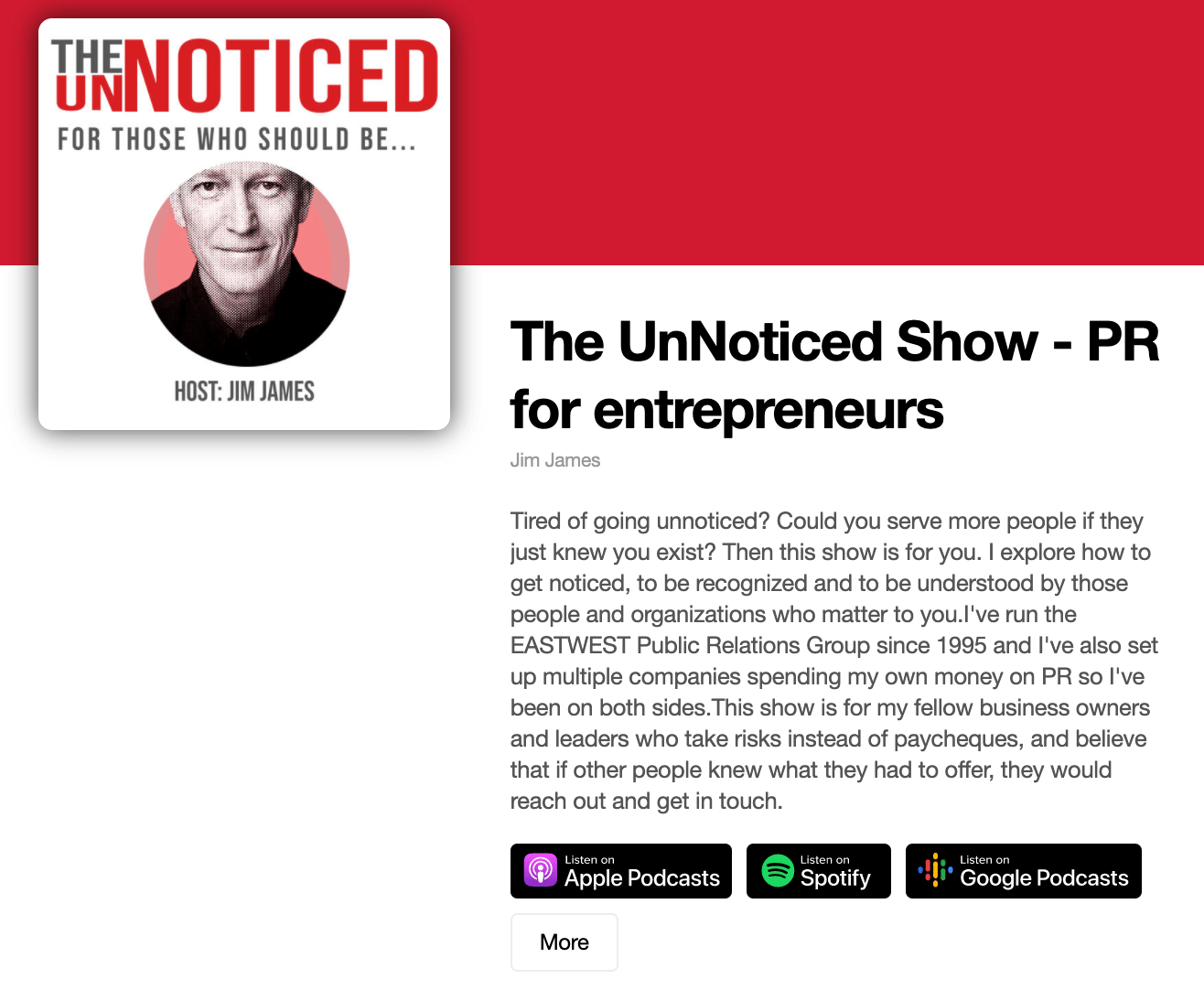 If you have concerns about how to get noticed, you can reach me at jim@eastwestpr.com. You can also tune in to The UnNoticed Podcast and perhaps you yourself can jump on the mic as part of your marketing strategy.